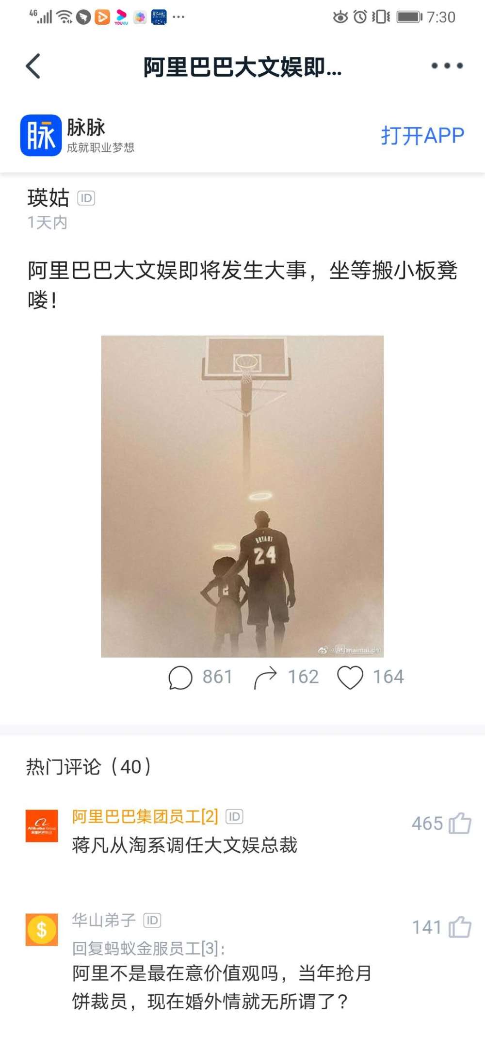 4月19日音讯,针对今天脉脉有传言称淘宝、天猫、阿里妈妈工作群总裁蒋凡将调至阿里大文娱一事,阿里大文娱相关人士向AI财经社回应称:“流言”。