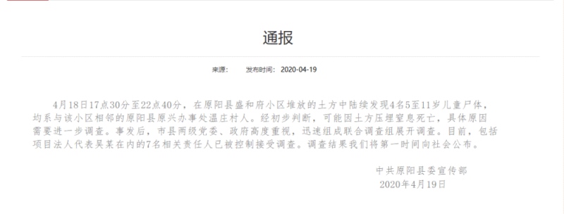 据当地宣扬部分通报,4月18日,河南省新乡市原阳县在建盛和府工地堆积的土方中,发现4个5至11岁小孩尸身,初步判断或许因土方压埋窒息逝世,该项目法人代表等7名负责人已被操控,正在承受查询。