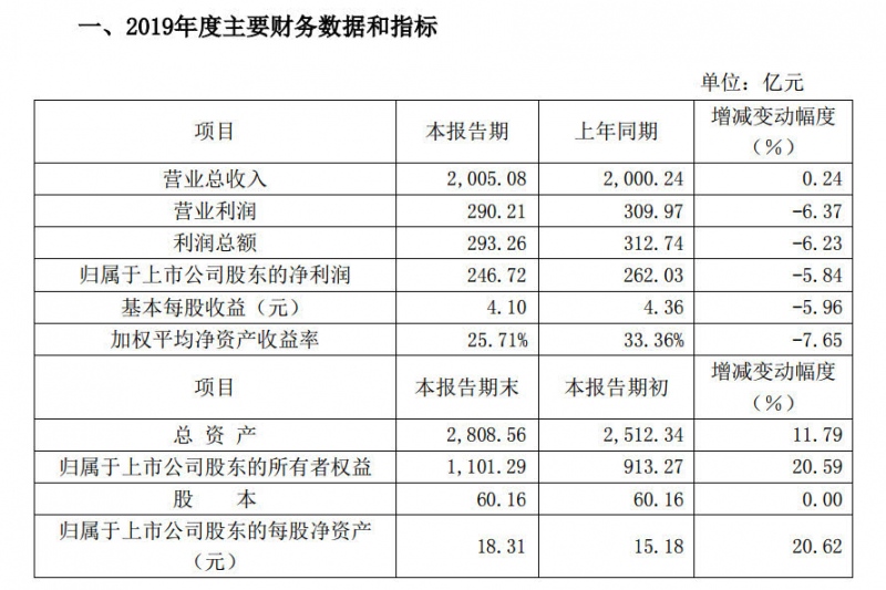 格力在年报预告中公布的财务数据和指标并不多,全部数据如上图所示。其中营收2005.08亿,同比增长0.24%;归母净利润246.72亿,同比下滑5.84%;净资产收益率25.71%,去年同期为33.36%。