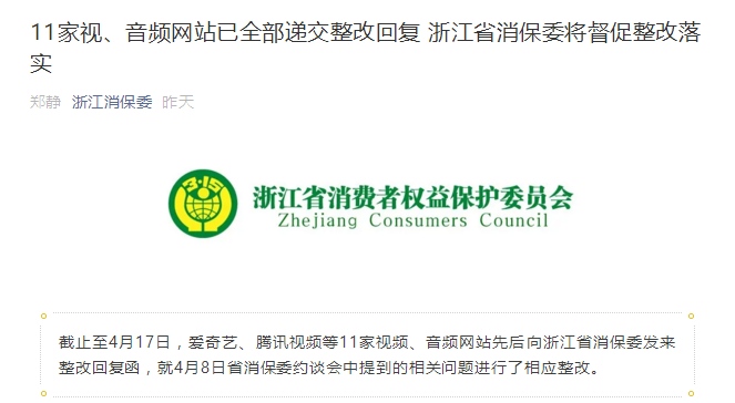 据浙江省消保委官方微信20日音讯,截止至4月17日,爱奇艺、腾讯视频等11家视频、音频网站先后向浙江省消保委发来整改回复函,就4月8日省消保委约谈会中说到的相关问题进行了相应整改。