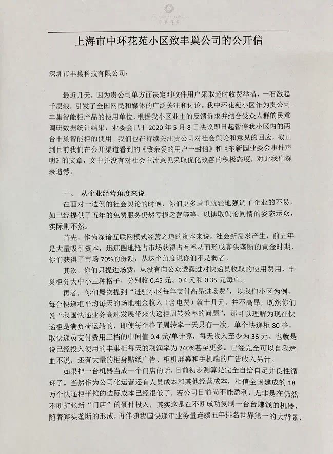 在丰巢回应杭州东新园小区及宣布公开信后,上海中环花苑小区业委会5月10日对相关问题进行了回应并表达最新诉求。