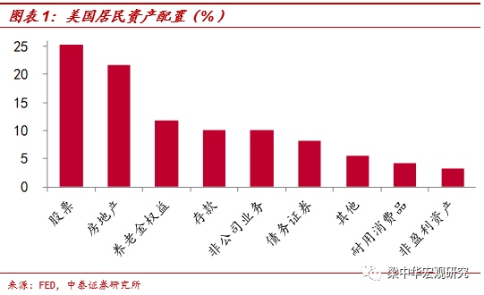 美国居民资产中,有将近50%为股票和房地产。在08年金融危机时期,股市和房地产的崩溃导致居民财富大幅缩水。自2007年3季度至2009年1季度期间,居民财富缩水了11万亿美元,其中股票资产缩水9万亿美元。尽管美国房价下跌到2011年中旬才结束,但股市开启了10年牛市行情,抵消了房地产对居民财富的部分拖累。