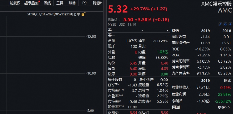 5月11日,万达旗下AMC文娱控股美股盘前一度涨超80%,开盘后,AMC涨幅收窄至20%但随后攀升,终究收报5.32美元,全日上涨29.76%,最新市值5.55亿美元。