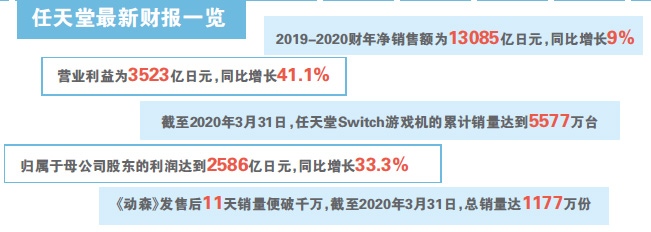 有必要留意一下的是,得益于这款火爆的游戏,任天堂也赚得盆满钵满。5月7日,任天堂发布到3月31日的2019-2020年财报。多个方面数据显现,任天堂本财年净出售额为13085亿日元,同比增加9%,经营利益为3523亿日元,同比增加41.1%,归属于母公司股东的赢利到达2586亿日元,同比增加33.3%。