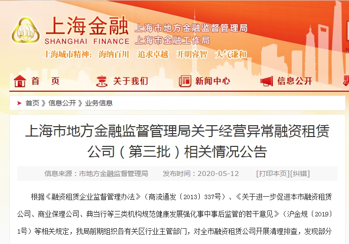 上海金融监管局表明,依据《融资租借企业监督管理办法》(商流转发〔2013〕337号)、《关于进一步促进本市融资租借公司、商业保理公司、典当行等三类组织标准健康开展强化事中过后监管的若干意见》(沪金规〔2019〕1号)等相关规定,该局前期组织了各有关区职业主管部门,对上海全市融资租借公司展开整理排查,发现部分企业存在运营反常情况。