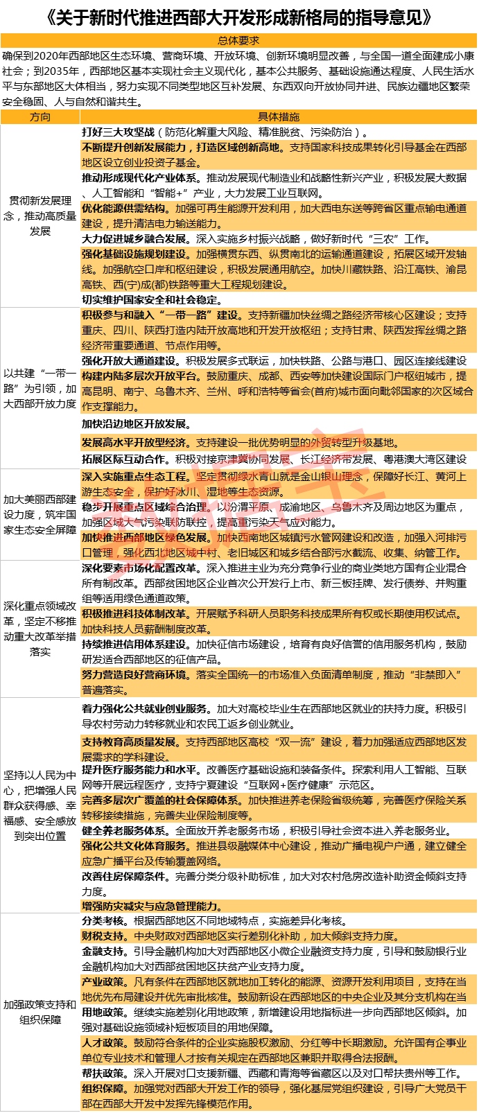 《意见》对于西部大开发提出覆盖短期和中期的总体目标:确保到2020年西部地区生态环境、营商环境、开放环境、创新环境明显改善,与全国一道全面建成小康社会;到2035年,西部地区基本实现社会主义现代化,基本公共服务、基础设施通达程度、人民生活水平与东部地区大体相当,努力实现不一样地区互补发展、东西双向开放协同并进、民族边疆地区繁荣安全稳固、人与自然和谐共生。