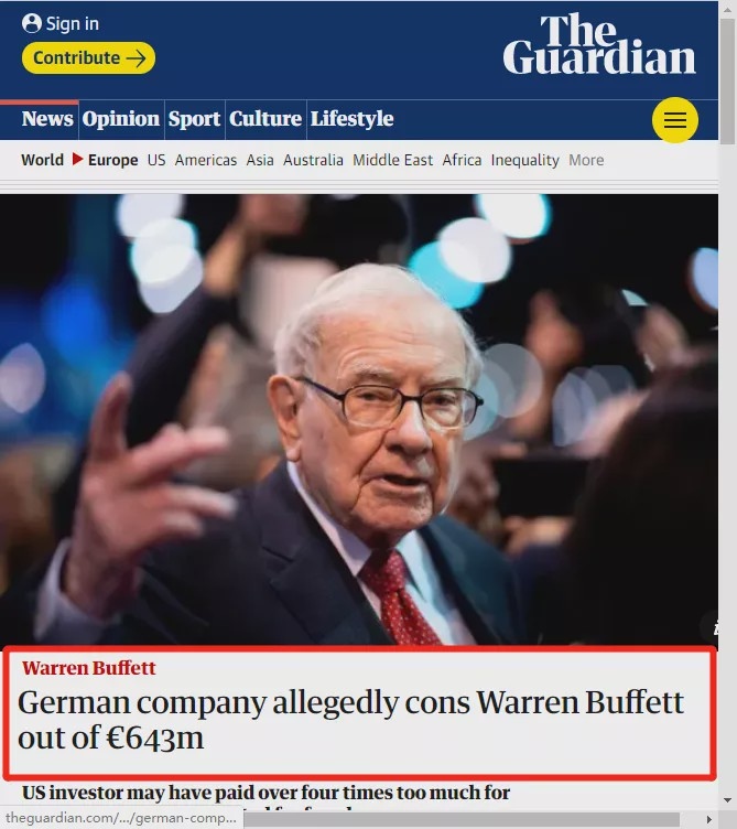 除了一季度出资亏了545亿美元(约合人民币3850亿元)、割肉航空股、掌握的伯克希尔股价跌跌不休、估值降至30多年来的最低水平外……近来,又被曝出被德国一家企业骗了6.43亿欧元(约合人民币50亿元)。