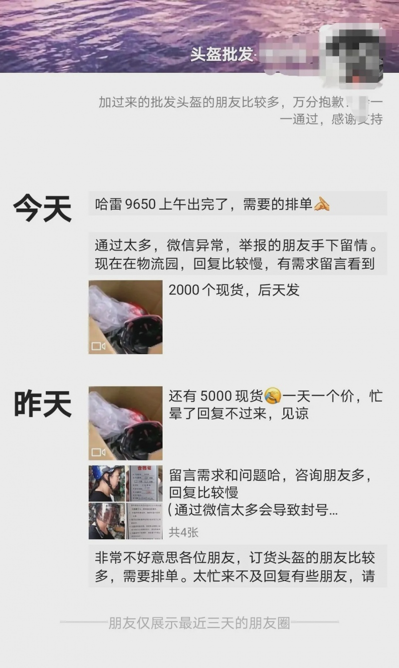 每日经济新闻记者近日也联系了多位头盔批发商,但多数电话处于忙音状态,记者又尝试加微信,也是在等待了将近一天后才显示通过。批发商金晨(化名)向记者解释称,因为担心通过微信太多会导致封号。5月20日一早,他又发了一条朋友圈,称“通过太多,微信异常,请举报的朋友手下留情”。