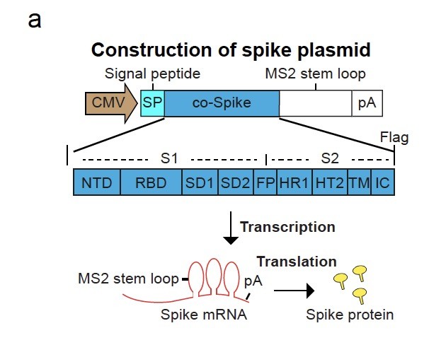 为了将全长刺突mRNA包装到病毒模仿颗粒中,研讨者还规划了一个刺突构建体,该刺突构建体在其转录物上表达带有6X MS2 stem loop的刺突蛋白,这使得刺突mRNA经过与MS2外套交融的GagPol相互效果而被包装到病毒模仿颗粒中。