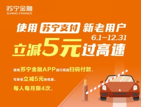 即日起至6月30日,实名新老用户使用苏宁金融APP支付江苏省内高速通行费,可享立减5元优惠。活动期间,同一用户最多可参与4次,名额有限,先到先得。