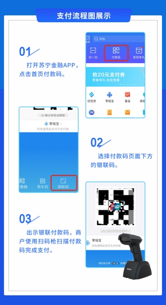 具体操作非常简单便捷:打开苏宁金融APP,点击首页付款码,选择付款码页面下方的银联码,出示银联付款码,商户使用扫码枪扫描付款码完成支付即可。