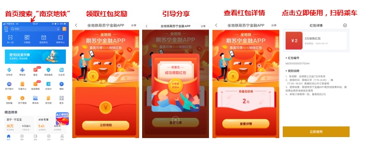 活动期间,登录苏宁金融APP,首页搜索“南京地铁”,即可进入活动页。新用户当日首次登录,可免费领取10元地铁新人礼包(1张4元,2张2元,2张1元);老用户可领取1张2元红包。新人礼包限领取1次,老用户奖励每天均可领取1次,最多可领5次。领取红包后,7天内使用苏宁金融APP乘车码,就可以扫码优惠乘南京地铁了。