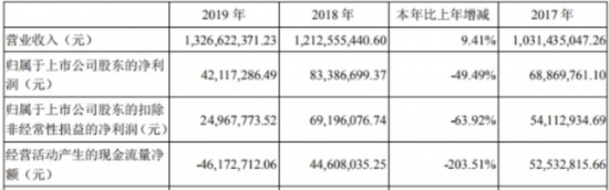 上市第三年,安奈儿营收增加,净利下滑近5成。2019年,安奈儿实现营业收入13.27亿元,同比增加9.41%;归属于上市公司股东的净利润4211.73万元,同比减少49.49%;归属于上市公司股东的扣除非经常性损益的净利润2496.78万元,同比减少63.92%;经营活动产生的现金流量净额-4617.27万元,同比减少203.51%;主营业务毛利率54.06%,比上年同期减少3.31个百分点。