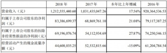 上市第二年,安奈儿的业绩增长。2018年,安奈儿实现营业收入12.13亿元,同比增长17.56%;归属于上市公司股东的净利润8338.67万元,同比增长21.08%;归属于上市公司股东的扣除非经常性损益的净利润6919.61万元,同比增长27.87%;经营活动产生的现金流量净额4460.80万元,同比减少15.09%;主营业务毛利率57.37%,比上年同期增加0.84个百分点。
