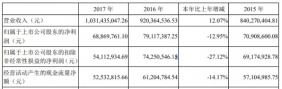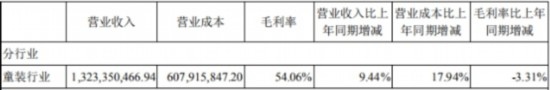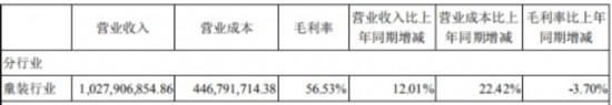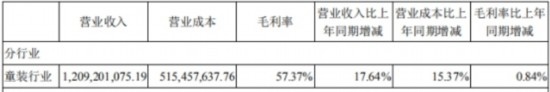 上市当年,安奈儿增收不增利。2017年,安奈儿实现营业收入10.31亿元,同比增长12.07%;实现归属于上市公司股东的净利润6886.98万元,同比减少12.95%;归属于上市公司股东的扣除非经常性损益的净利润5411.29万元,同比减少27.12%;经营活动产生的现金流量净额5253.28万元,同比减少14.17%;主营业务毛利率56.53%,比上年同期减少3.7个分点。