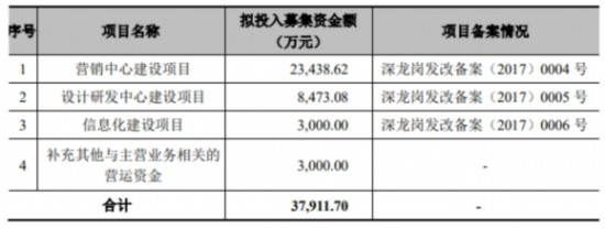安奈儿上市时披露的公告书显示,公司上市发行股份数量不超过2500万股,募集资金总额为4.27亿元,扣除发行费用后募集资金净额为3.79亿元,分别用于“营销中心建设项目”、“设计研发中心建设项目”、“信息化建设项目”、“补充其他与主营业务相关的营运资金”。