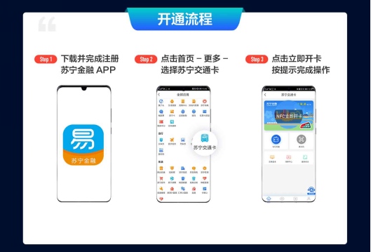 那么,怎么免费开通金陵通NFC交通卡?上苏宁金融APP搜索“交通卡”,或者在APP内首页点击“更多”,选择“苏宁交通卡”,再点击“立即开卡”,按提示完成操作,就大功告成了。