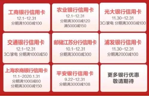 除此之外,还有分期满减活动奉上:用苏宁支付绑定工商银行信用卡,享分期满1000元减100元;绑定农行信用卡,享分期满3000元减120元或满5000元减150元;绑定邮储银行信用卡,享分期满3000元减300元;绑定交通银行信用卡享分期满1000元减50元;绑定光大银行信用卡,享分期满3000元减100元;绑定浦发银行信用卡,享分期满2000元减100元;绑定上海农商行信用卡,享分期满1000元减60元或满3000元减150元。以上活动名额有限,先到先得哦。