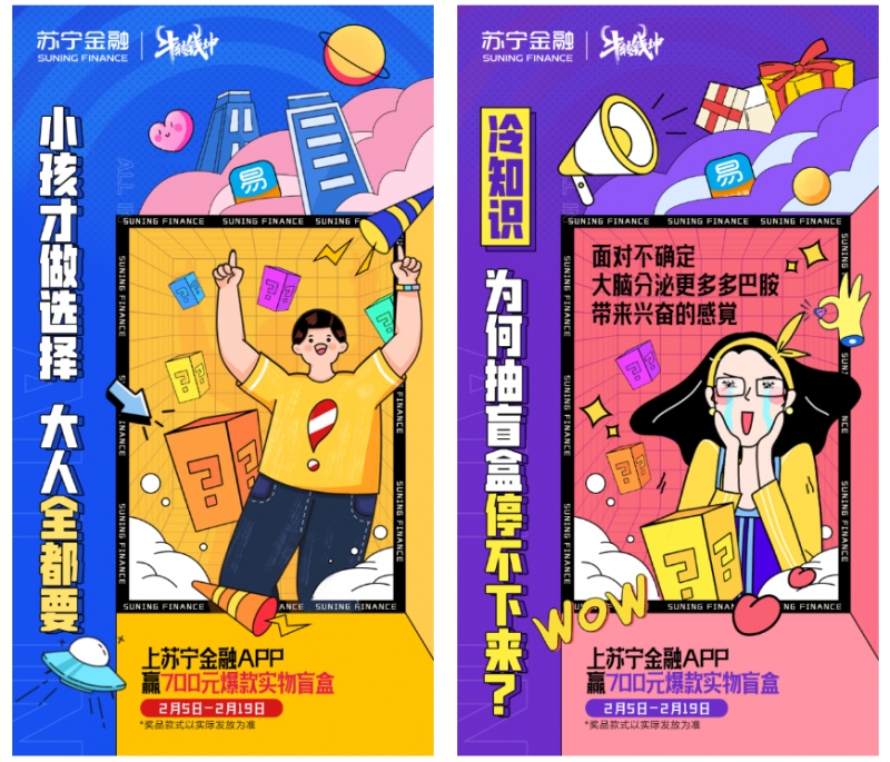 据说这是目前盲盒饭圈的流行语。你买盲盒了吗?盲盒,是指消费者不能提前得知具体产品款式的玩具盒子,因其随机属性产生不确定的刺激,成为具有Z世代泛二次元属性的“潮玩”,也反映出人们对生活中惊喜的期待。在牛年新春到来之际,苏宁金融推出盲盒抽奖活动,价值700元盲盒及最高288元支付券等你拿回家。