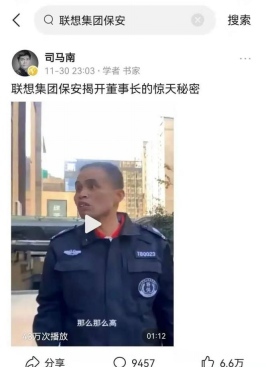 上边是司马南微博、今日头条视频的截图,这俩个传播范围最大。其中,司马南微博视频观看44.2万次,转发1441次,评论1516,点赞1.4万。今日头条视频观看43万次,评论9457,点赞6.6万。乍一看,保安都气愤得站出来揭秘了?看来联想真有事?